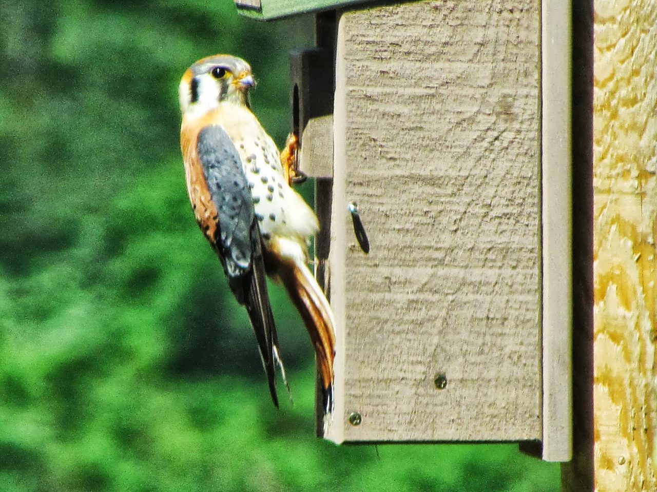 And so I left them. And watched them. Since they were busy here, I reasoned, they’d leave the other box alone. So I took pictures daily after the babies hatched and grew into soft balls of fluff. I even saved them from the kestrel I saw clinging to the box one day.